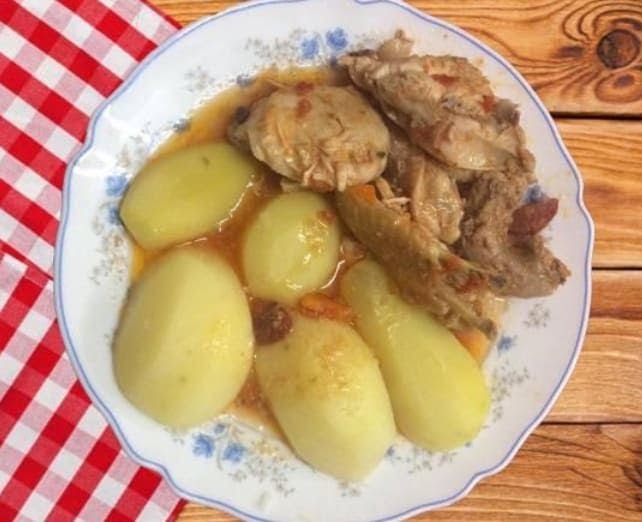 Carnes de porco, enchidos, carne de vaca, batata cozida, couve, cenoura, nabo e arroz.
